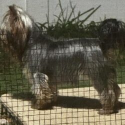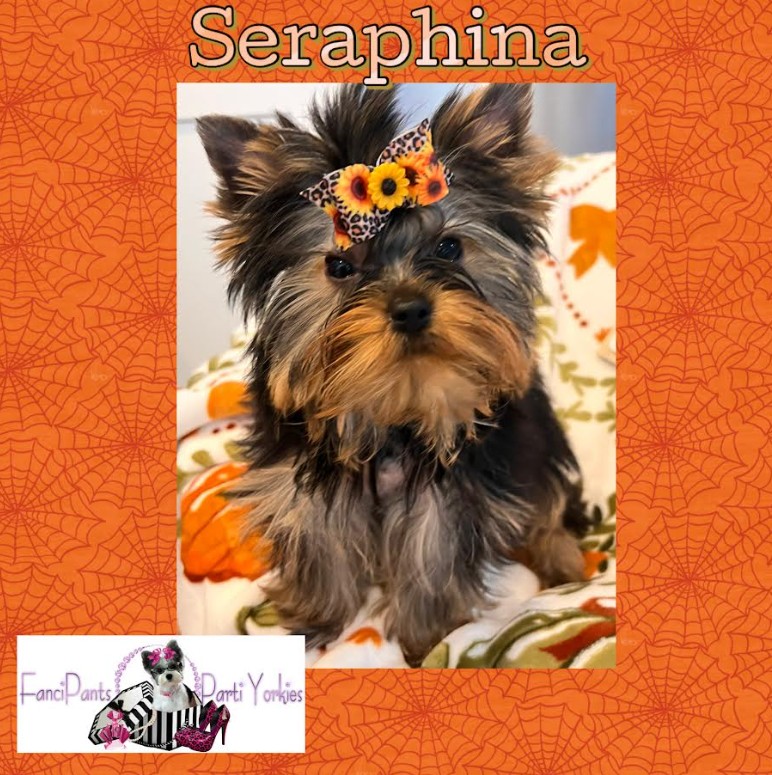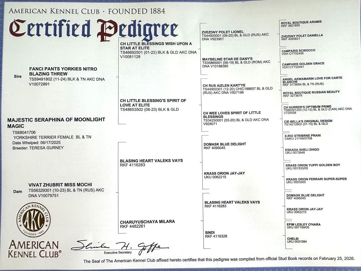 Fancy Pants Is an AKC Parti Yorkie that carries chocolate. “She’s a sweetheart. Elegant in posture, soft gentle motions, very sweet Yorkie.” is a charmer , so elegant and graceful. She reminds me of “Princess Grace”. She loves to snuggle and get her belly rubs. She gets along with all the animals with her soothing and calm personality.